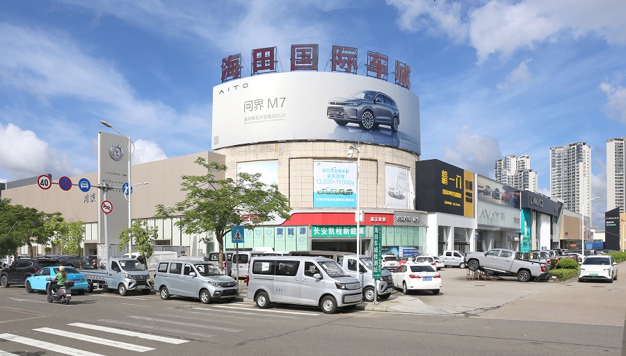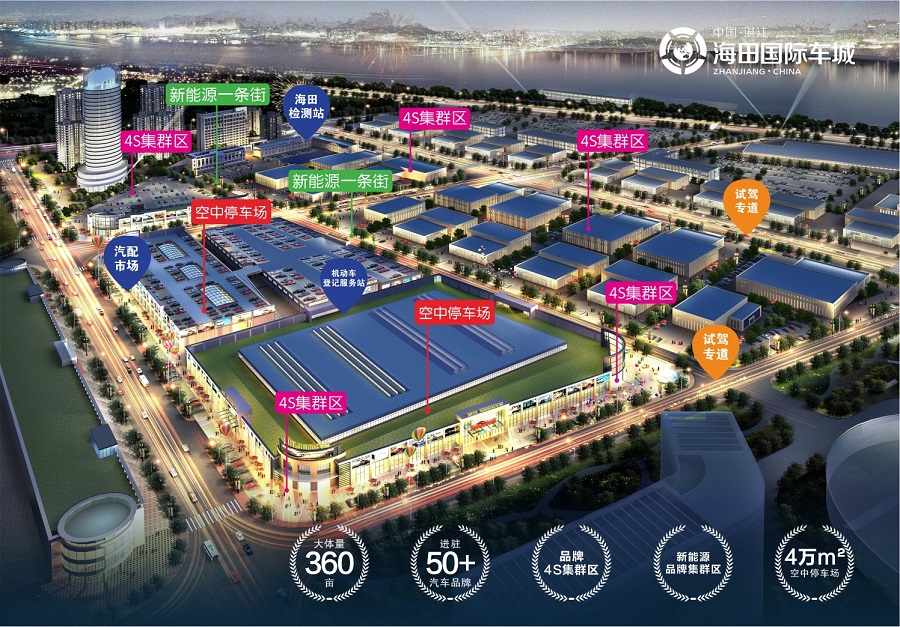 2014年首期建成投入运营,共吸引了8家上市企业、13家集团公司、30多家有限公司以及大小商家共一百多家,拥有奔驰、奥迪、凯迪拉克、斯巴鲁等50多个汽车品牌4S店和专卖店;建有大型室内汽车展馆、汽配交易中心、湛江市公安局交警支队车管所授权的海田车城登记服务站、年检测能力达10万辆的机动车检测站,为市民打造了上牌、年审、购税、金融、保险、维修、精品、美容等一站式配套服务。