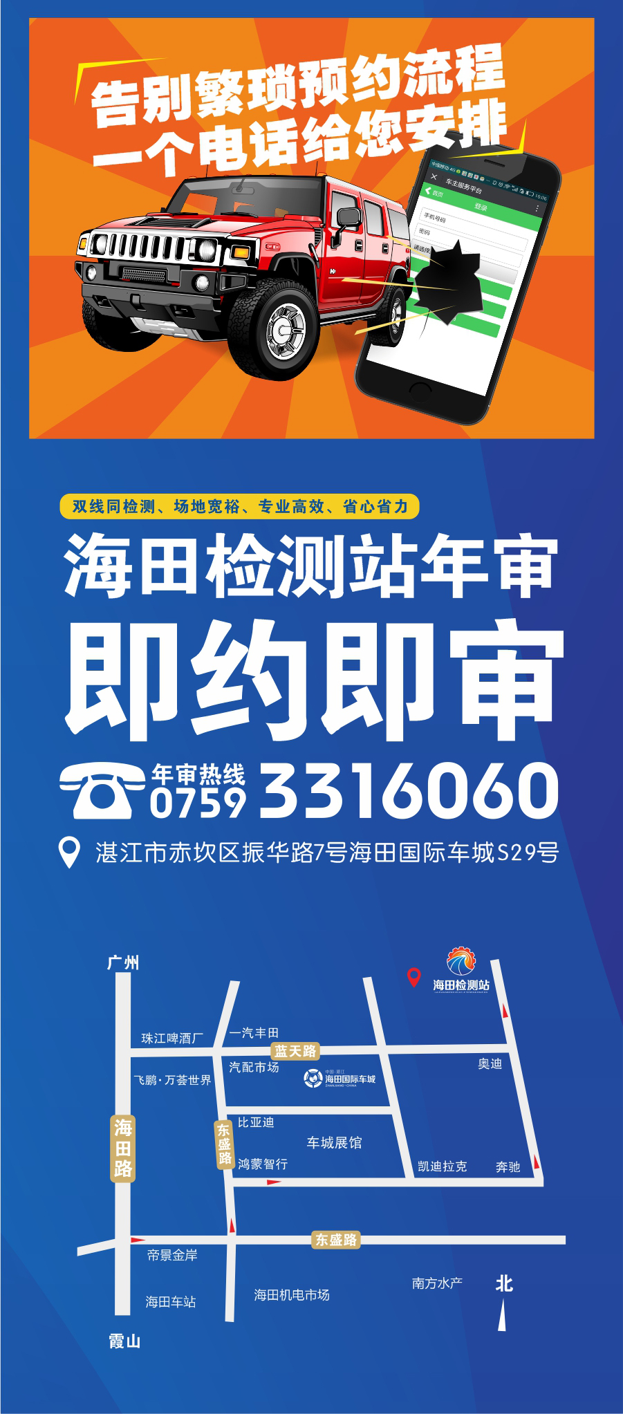 海田机动车检测站位于湛江海田车城内,设有大型停车场。主要经营机动车安全检测业务以及机动车尾气环保检测业务,具备了简易工况法及加载减速工况法检测设备能力,规模大,技术水平领先。